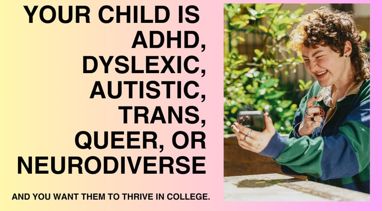 For neurodiverse and marginalized youth, the college admissions and financial aid processes can be complex and overwhelming. With both a single mom of an ADHD kid and a queer & neurodiverse college grad on your team, we can help to demystify the process and break it down into manageable steps that work with your unique circumstances, providing support every step of the way.